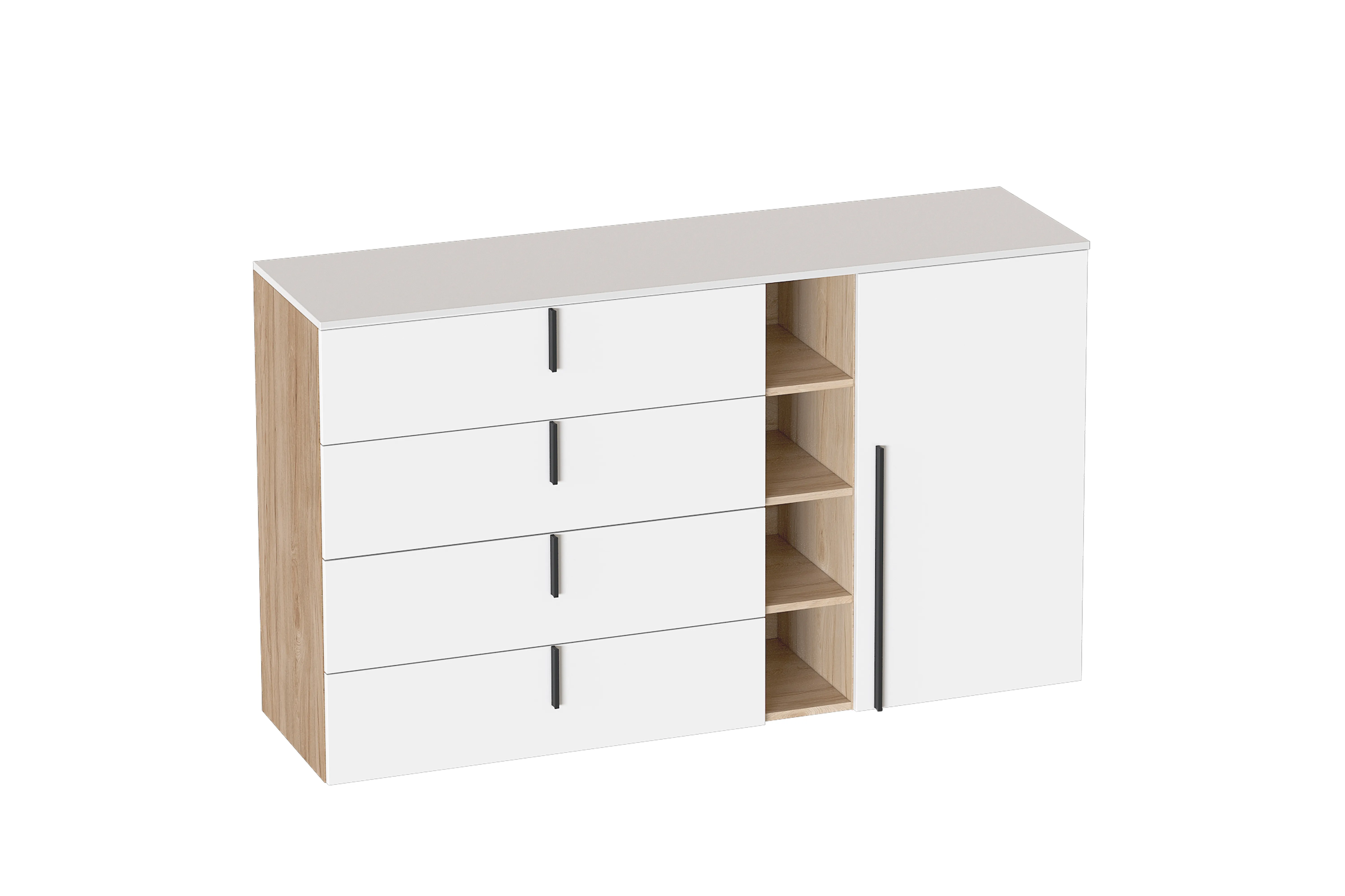 Внутри комода пространство разделено на 3 секции, в левой находится 4 ящика на шариковых направляющих. Средняя секция - открытая с полками. Правая секция закрыта распашной дверью, за которой расположены 2 стационарные полки.