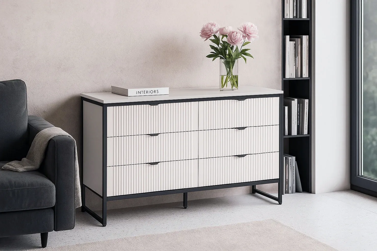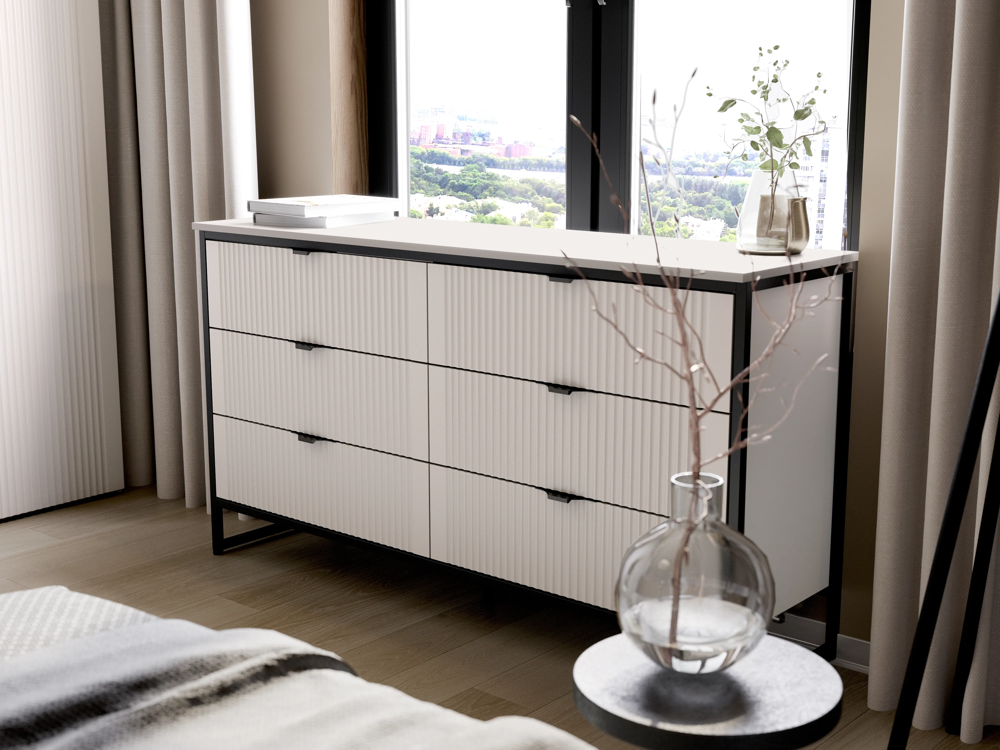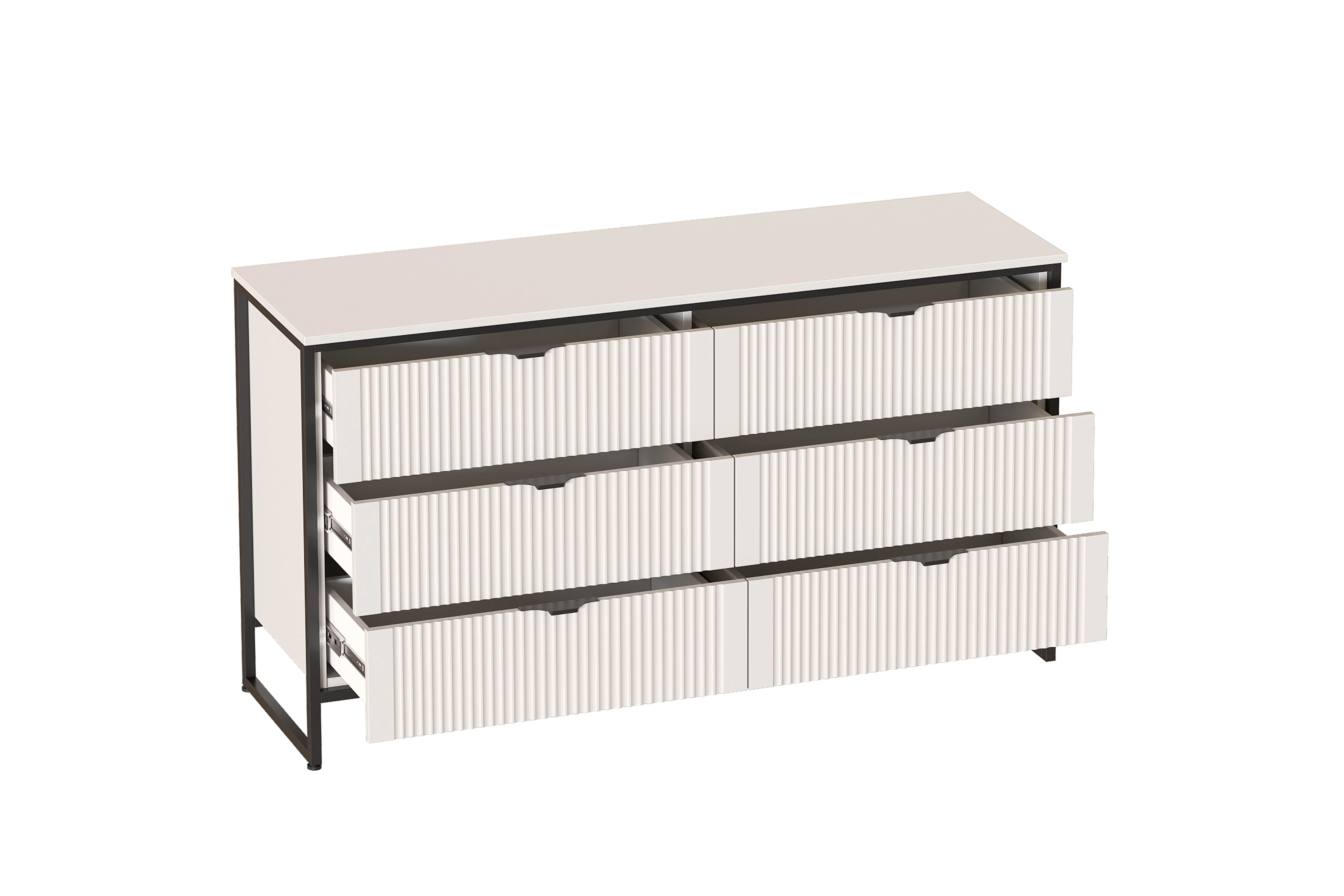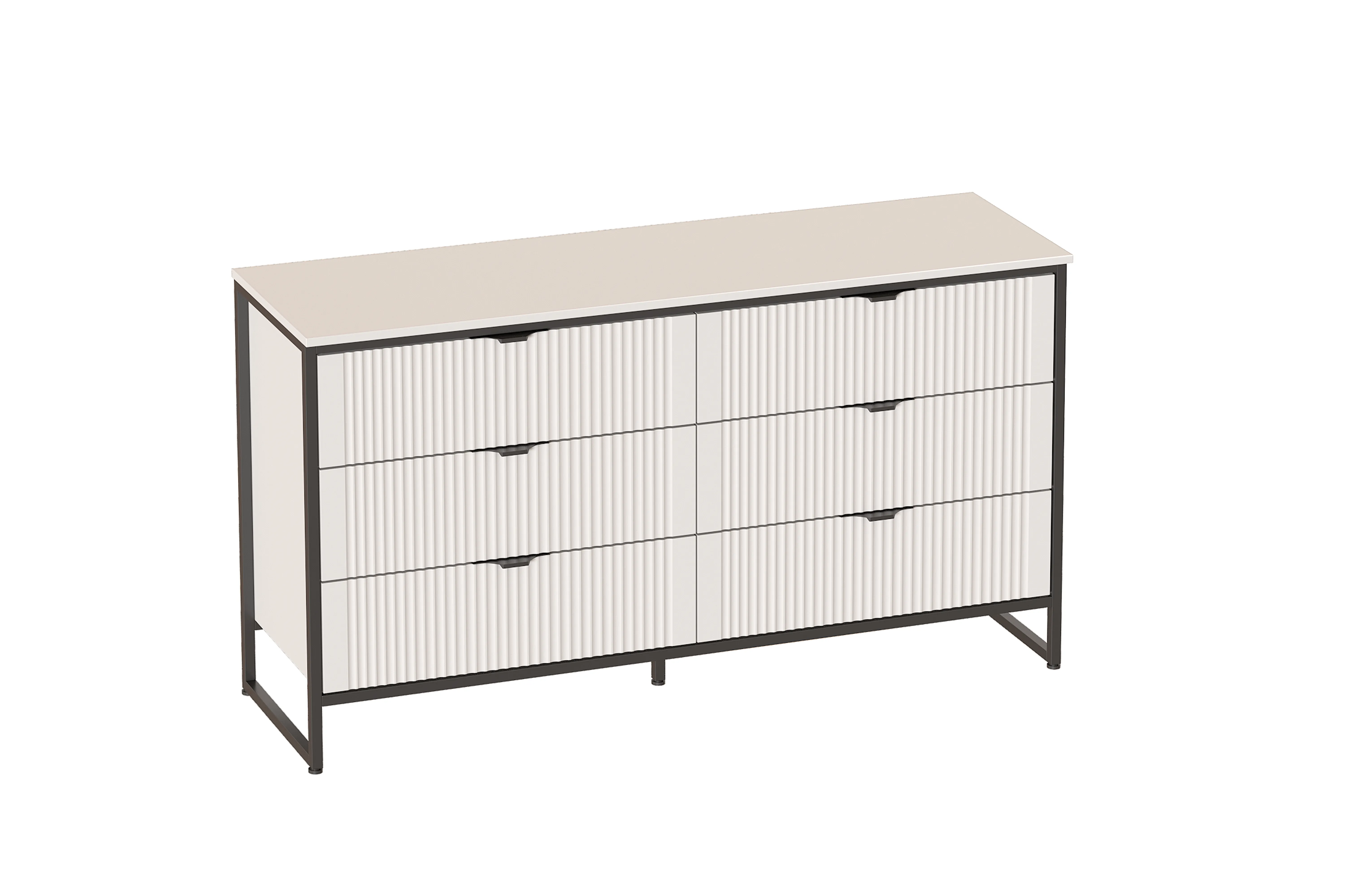 Комод "Нора" на металлокаркасе состоит из выдвижных ящиков, что позволяет удобно хранить вещи и поддерживать порядок в комнате. Внутреннее пространство разделено стенкой на два отделения, в каждом из которых установлены по три выдвижных ящика на шариковых направляющих с доводчиками. Он выполнен из безопасных, качественных материалов (лдсп и мдф), что гарантирует долговечность и сохранение первоначального вида на протяжении долгого времени.