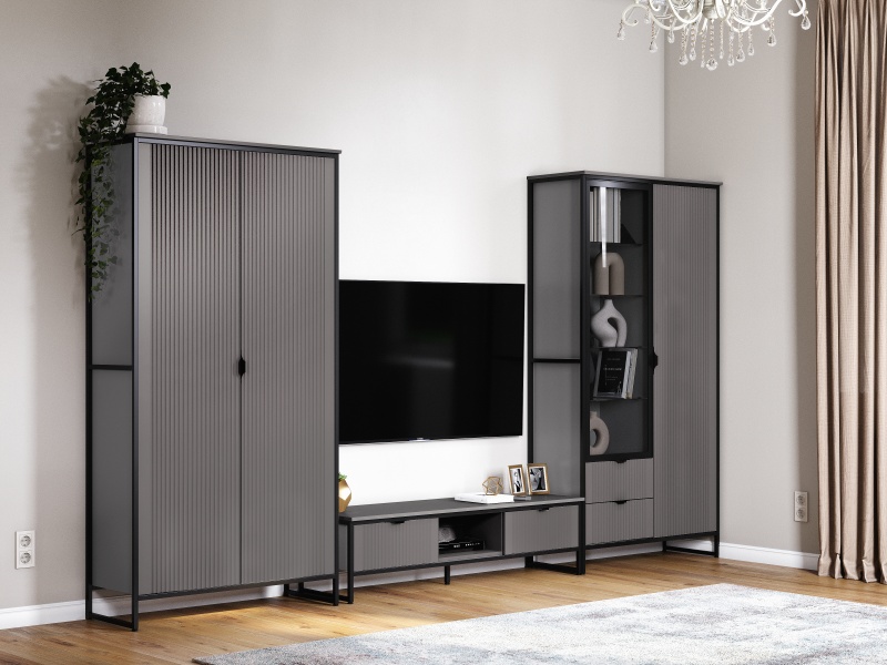 Коллекцию модульной гостиной "Нора" отличает современный оригинальный стиль. Декоративная продольная фрезеровка на фасадах из МДФ и опоры на металлокаркасе соответствуют модным тенденциям этого года в ведущих зарубежных коллекциях.