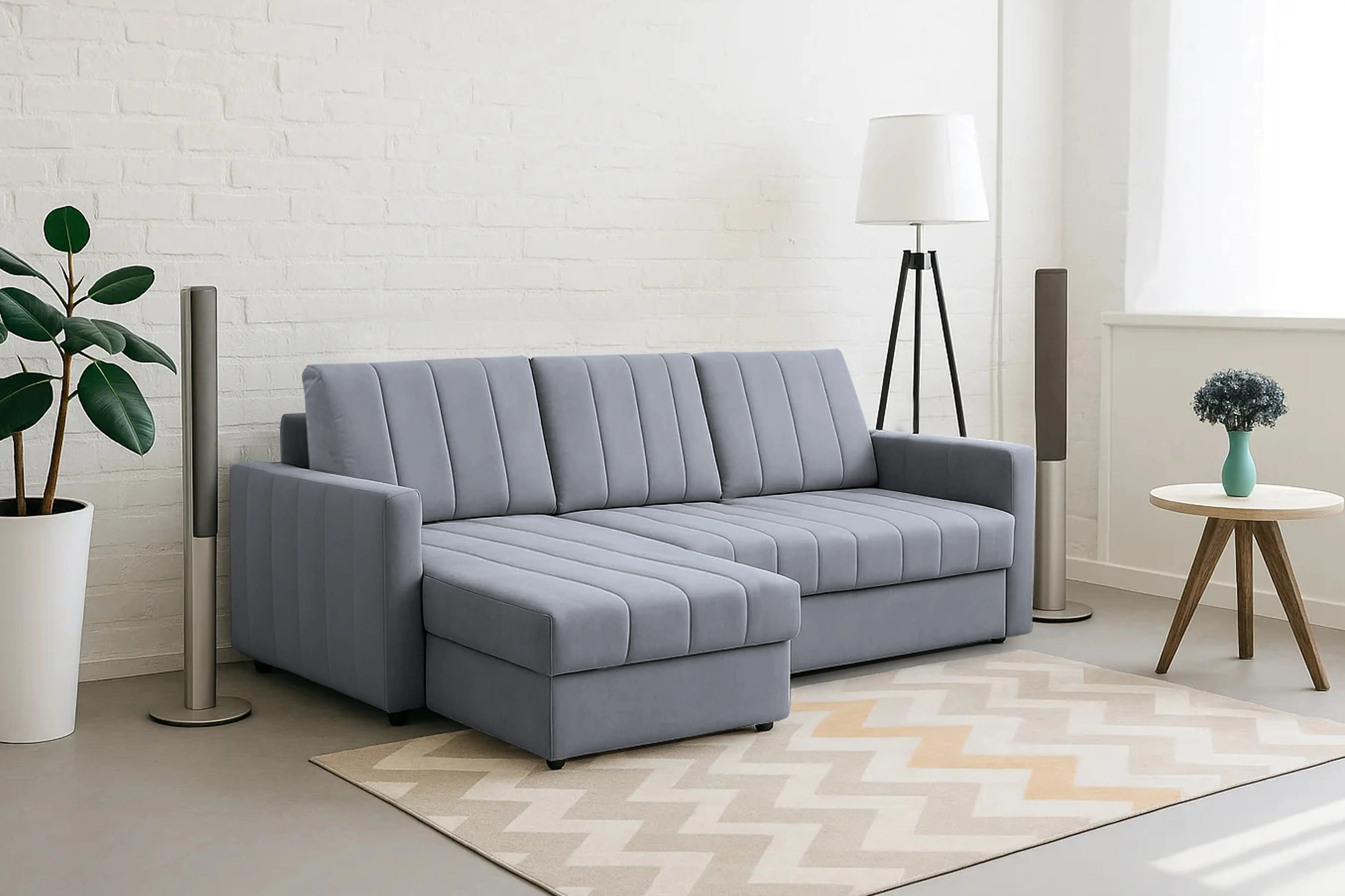 Диван удачно зонирует пространство и дополняет необходимым функционалом. В основании спального места блок независимых пружин для комфортного сна. Вместительный ящик для хранения постельных принадлежностей.